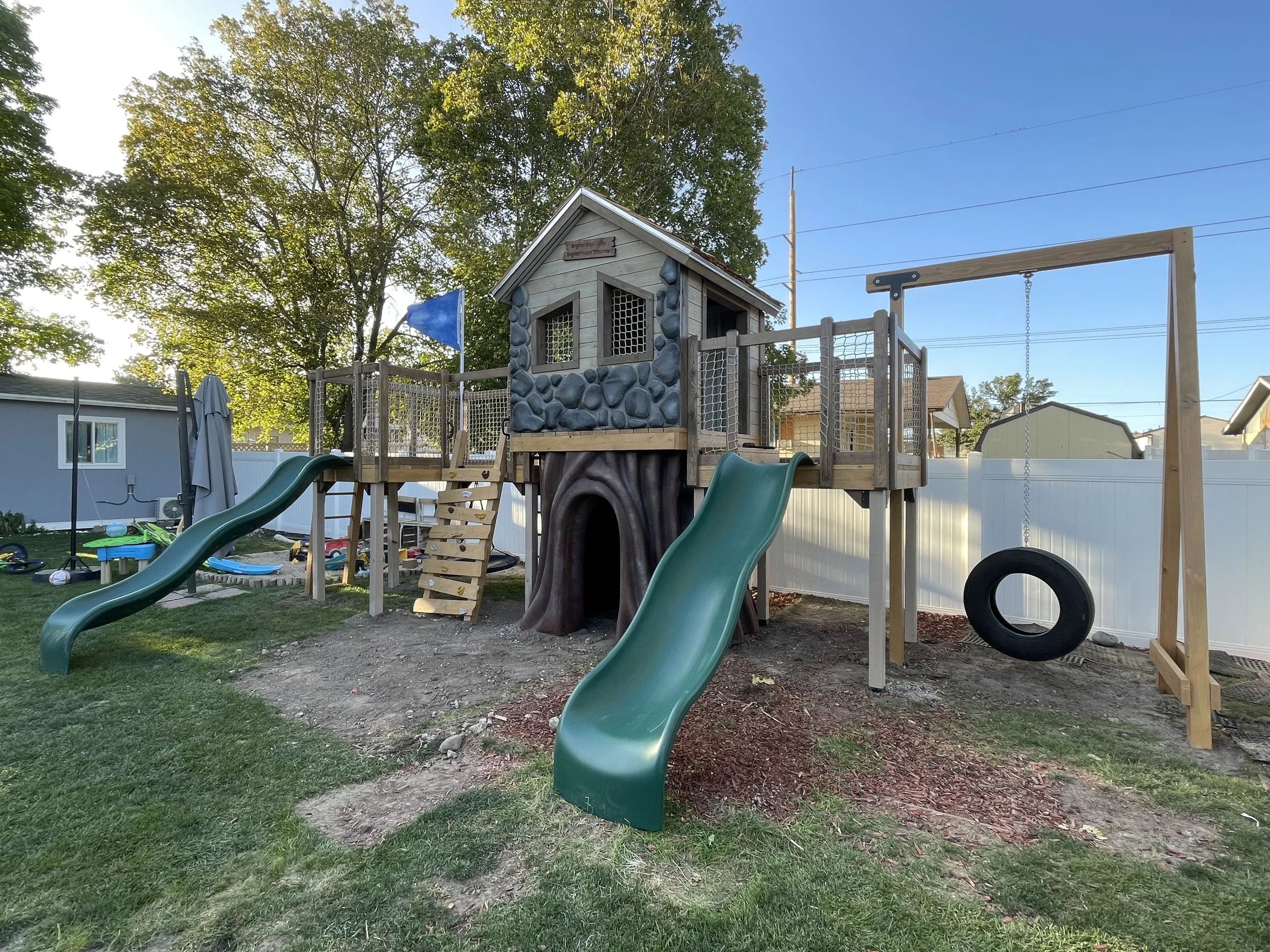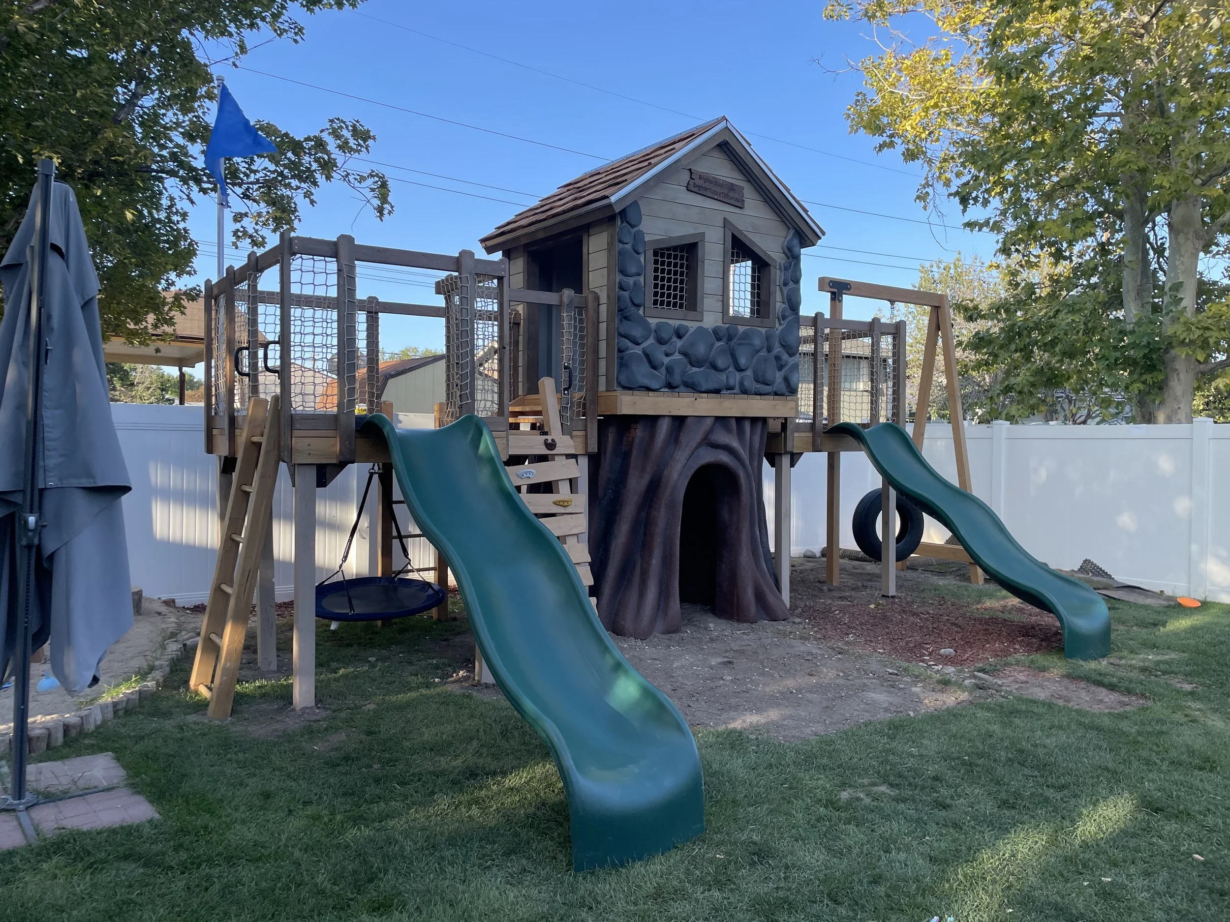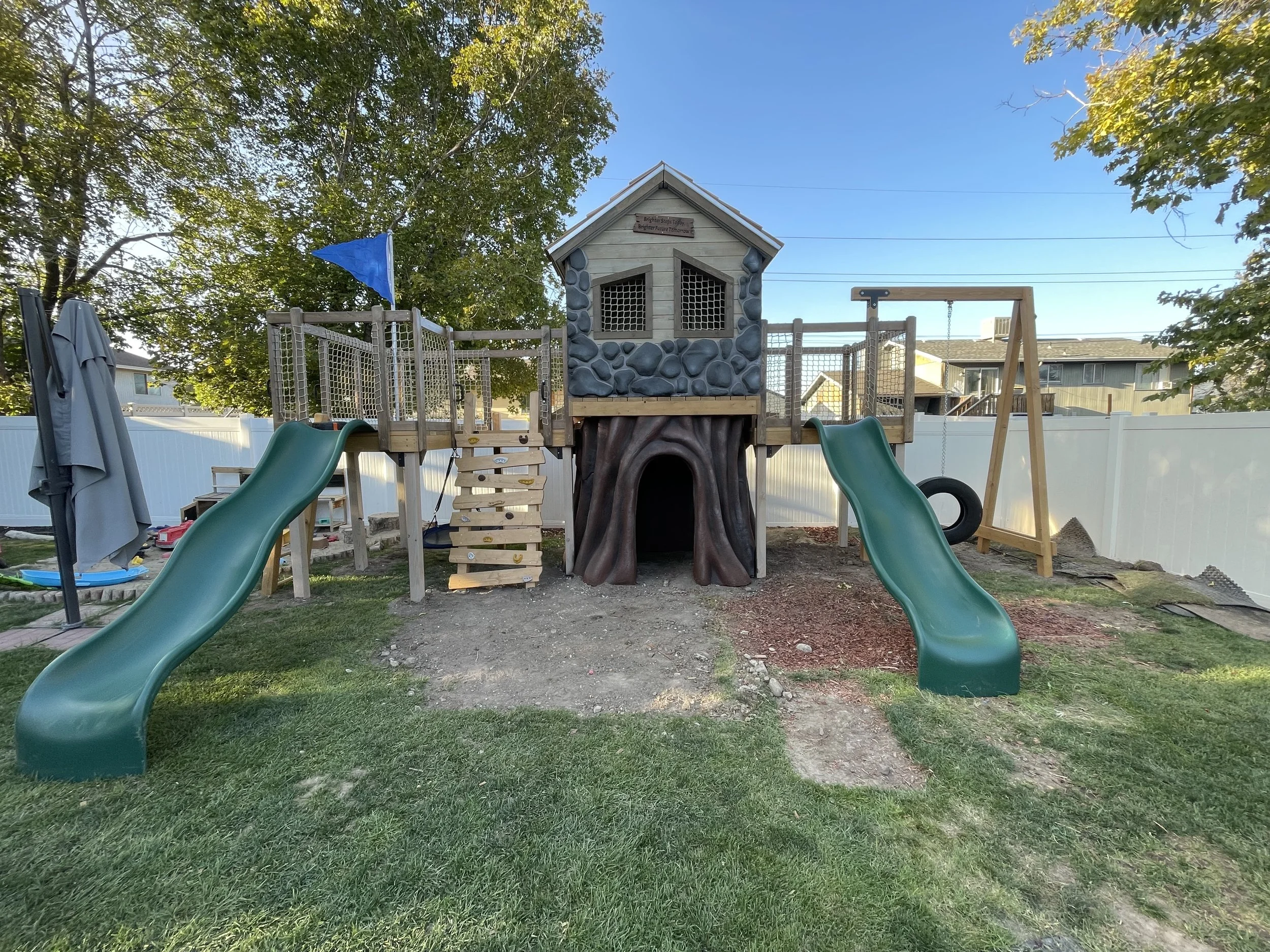 The Treefort Kingdom is the perfect blend of functionality and themed aesthetic. From its stone playhouse to the large tree base, we have you covered! This playground can be placed inside or outside, making it perfect for whatever application you have for it. This will give any kids hours of experiences and physical fun. Come get a quote today!